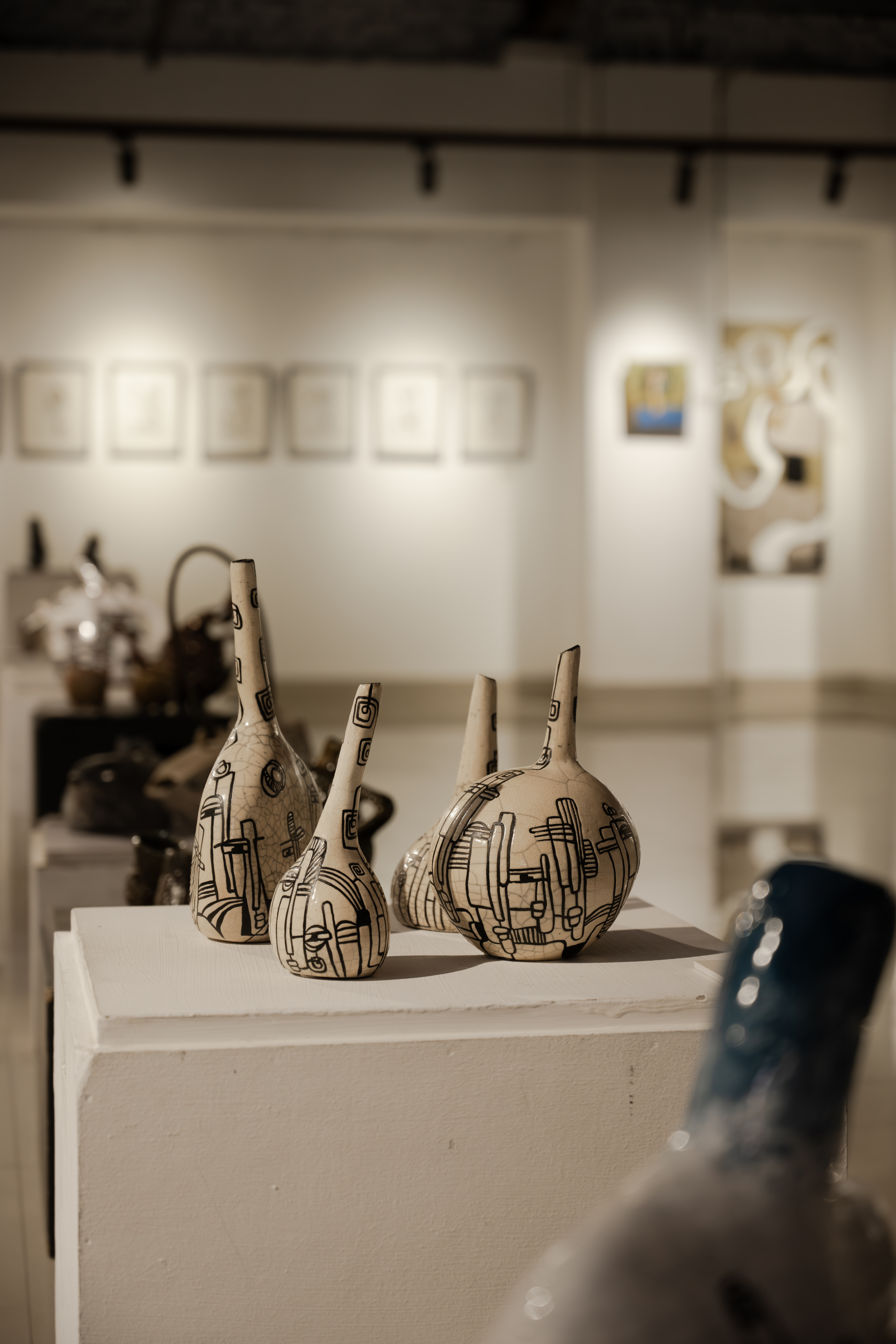 One of the most compelling aspects of Antardrishti is its exploration of duality. Shrestha moves fluidly between painting and ceramics, gesture and structure, energy and matter. Her paintings often feature layered surfaces and geometric forms, hinting at contemporary life and the fragmentation of modern identity. In contrast, her ceramic works carry the weight of touch and of time. Together, these media interplay, and her artistic language finds its strength.
