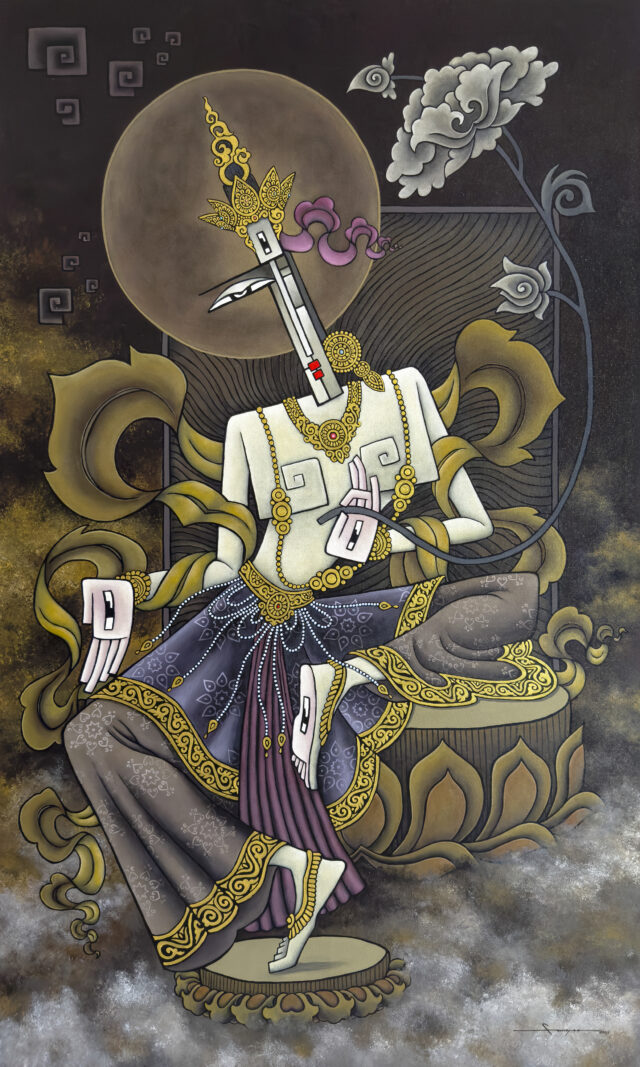 Growing up in Nepal, where ritual, symbolism and spirituality are woven into everyday life, Shrestha developed an early understanding of the sacredness of creation. From temples and ancestral traditions to handcrafted objects, meaning has always extended beyond the material. This cultural grounding is deeply embedded in her work. Her female figures, often depicted with one eye gently open, emerge as embodiments of a modern Shakti, aware, resilient and deeply connected to inner truth.