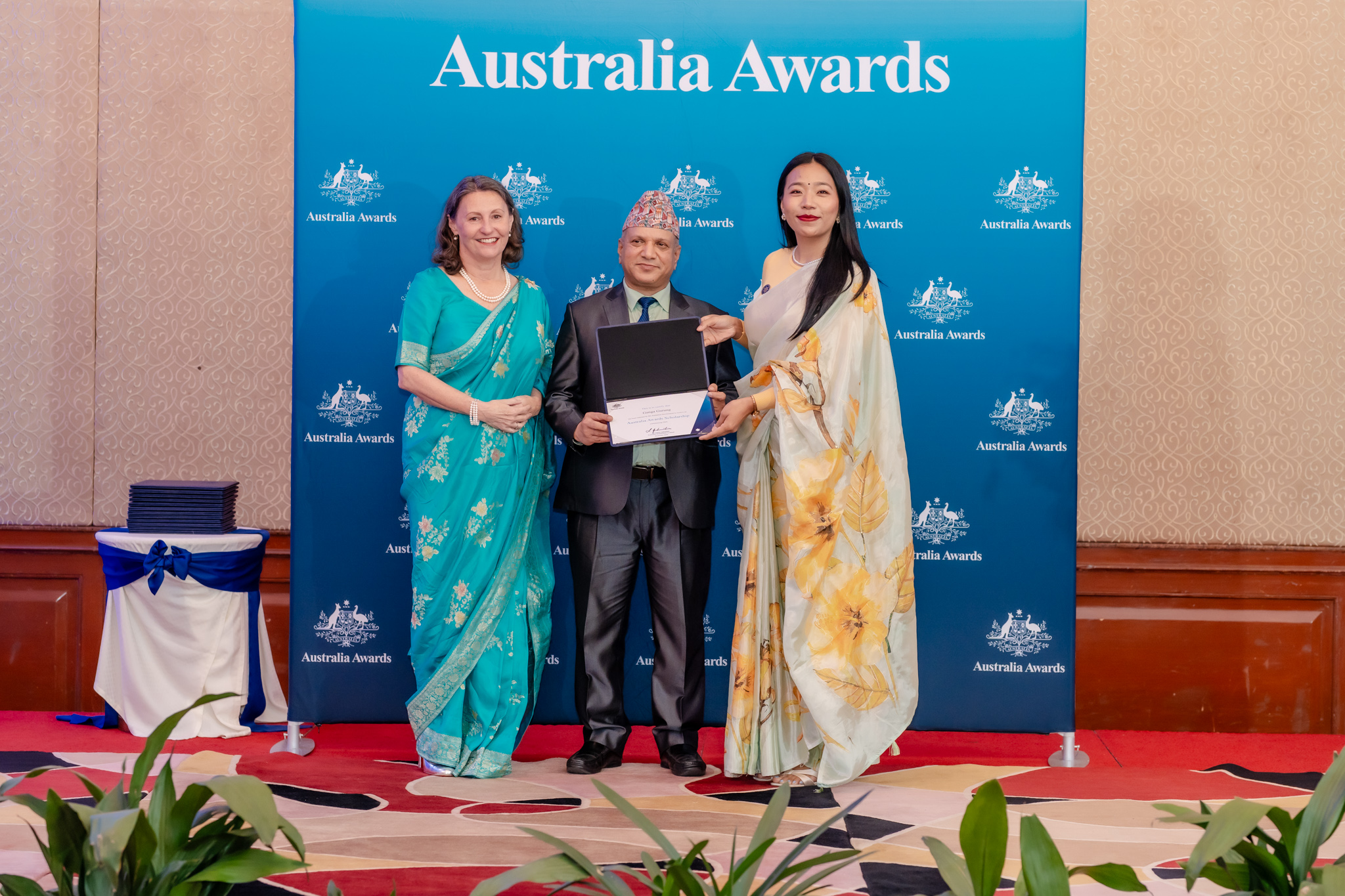 Australia’s Ambassador to Nepal HE Leann Johnston, and Secretary of the Ministry of Education, Science and Technology, Mr Choodamani Paudel presenting Australia Awards Scholarship to the Awardee Photo Credit: Australia Awards Nepal Team