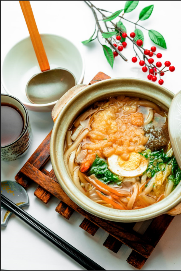 A single serving clay pot filled with broth, udon, and various ingredients, simmered to perfection. This dish warms you from the inside out. The rich, savory flavor of the broth is exceptional, and many people enjoy drinking it down to the very last drop.