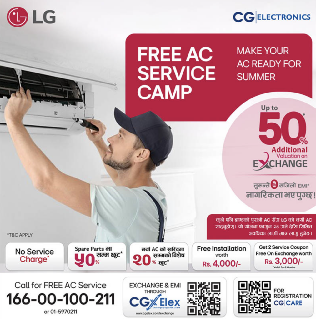 LG Electronics, in partnership with CG Electronics, has launched a nationwide free air conditioner service camp ahead of the summer season in Nepal. The initiative offers free inspection and servicing of LG AC units by trained technicians to ensure efficient cooling, improved energy performance, and longer product lifespan. Customers can also receive up to 50% discount on spare parts, a 20% discount on new AC purchases, and free installation worth Rs 4,000. Exchange offers provide up to 50% extra valuation on old units. Participants will receive service coupons worth Rs 3,000 and can access easy EMI facilities through CGX Elex.
