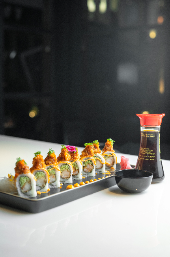A standout -The Dynamite Prawn Twist! It is an exhilarating taste of crispy tempura prawns wrapped in sushi rice and nori. Perfectlycrunchy, savory, and slightly sweet. Topped with a creamy, flavorful sauce, each bite offers a delightful contrast of textures. Visually striking and irresistibly tasty, this roll is a true standout dish for sushi lovers. What sets this twist apart is the tobiko pearls topping that crowns the roll. Hints of sweetness creates a balanced and memorable profile that keeps you reaching for more.
